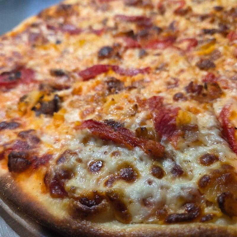 ”Jalapeno popper” pie, bacon, jalapeno, cheddar, mozzarella & cream cheese.
