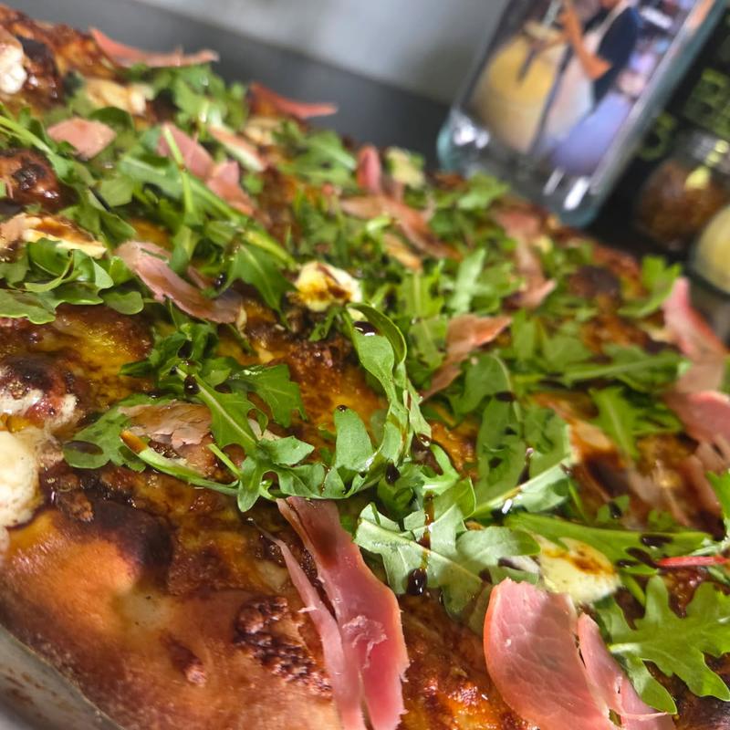 Fig sauce, mozzarella, arugula, prosciutto, mascarpone and a pinch of salt the pizza is rich, slightly sweet, and fresh for spring.